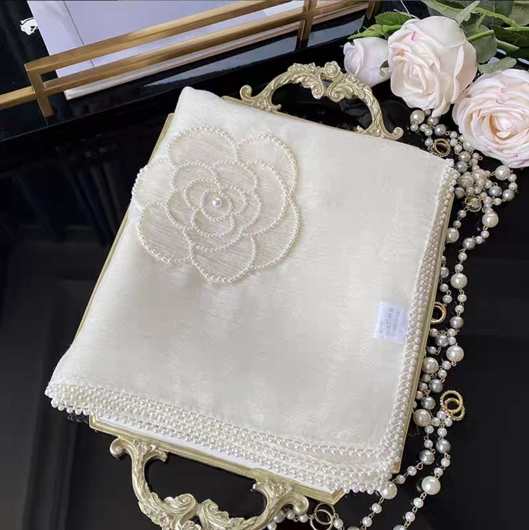 This exquisite white shawl is a timeless blend of softness and elegance, woven from premium 5A mulberry silk and natural wool. Designed with delicate hand-embroidered camellia flower patterns and pearl-beaded edging on all four sides, it delivers a refined aesthetic for special occasions or everyday luxury.