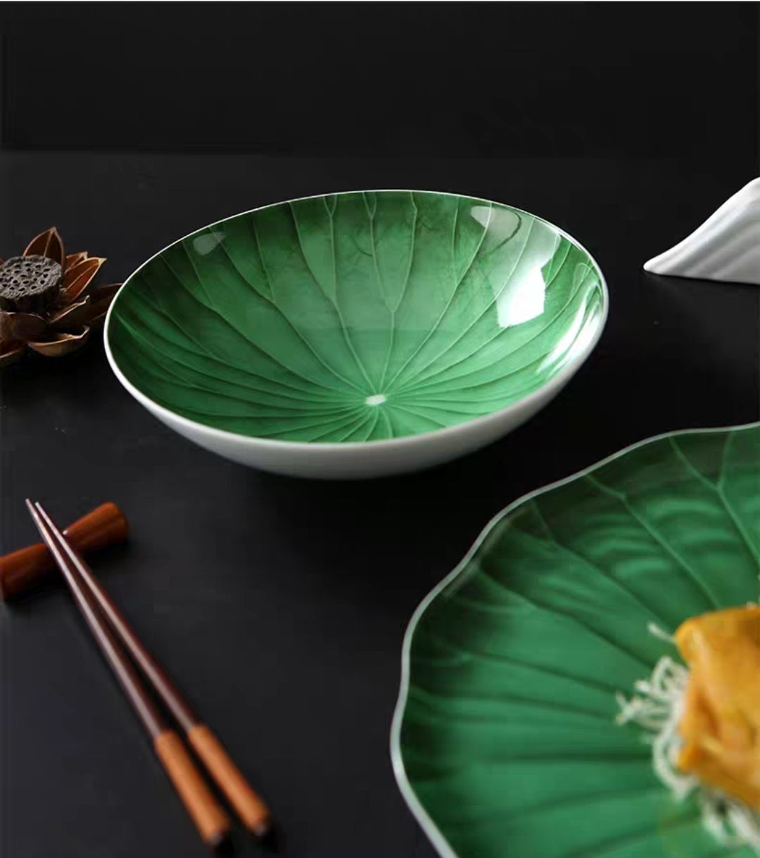 Bring natural elegance to the table. Inspired by the graceful lines of a lotus leaf, these richly glazed green ceramic plates turn every dish into a visual experience. The sculpted radial veining draws the eye to plated food, making them a favorite for chefs, food stylists, and design-forward home tables.
