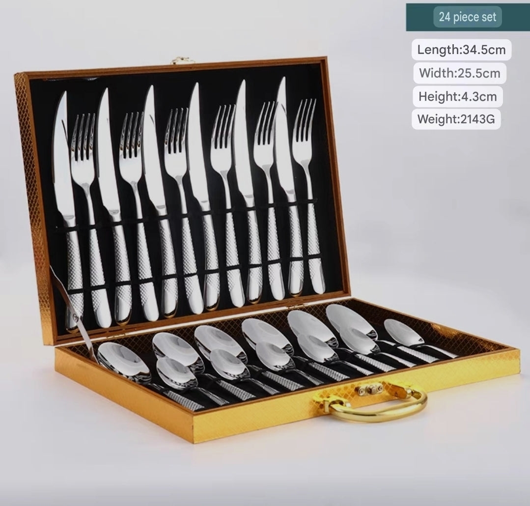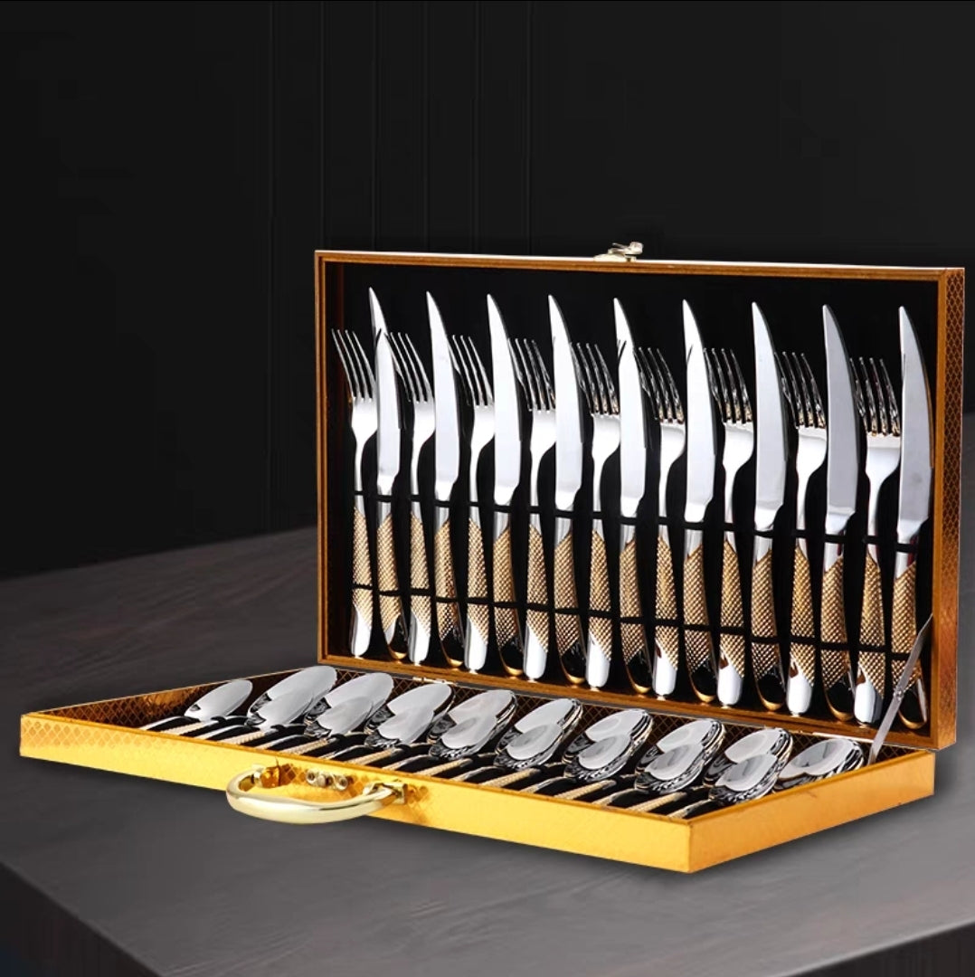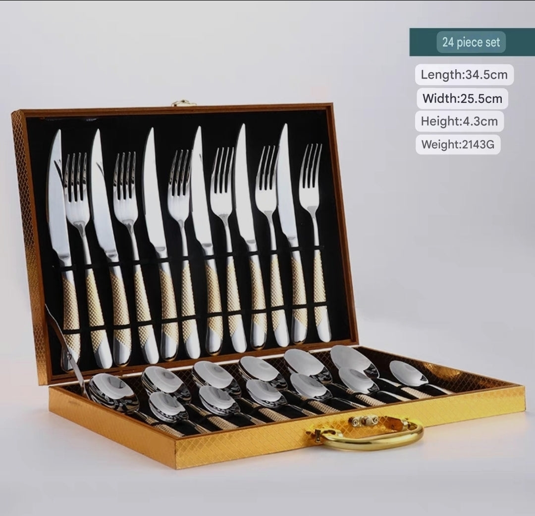 Elevate your dining table with this 24-piece luxury stainless steel cutlery set. Crafted from high-quality SUS304 stainless steel, each piece features a mirror-polished finish with elegant gold-accent handles, offering durability, style, and comfort.