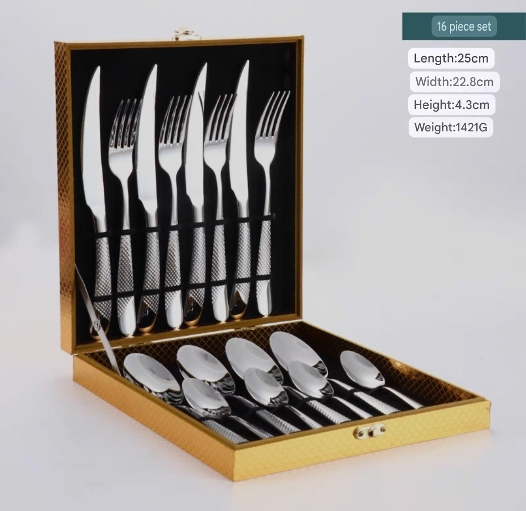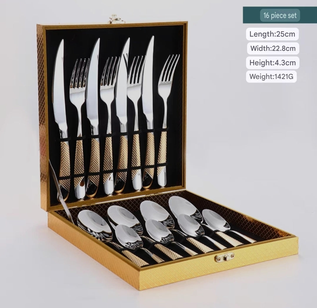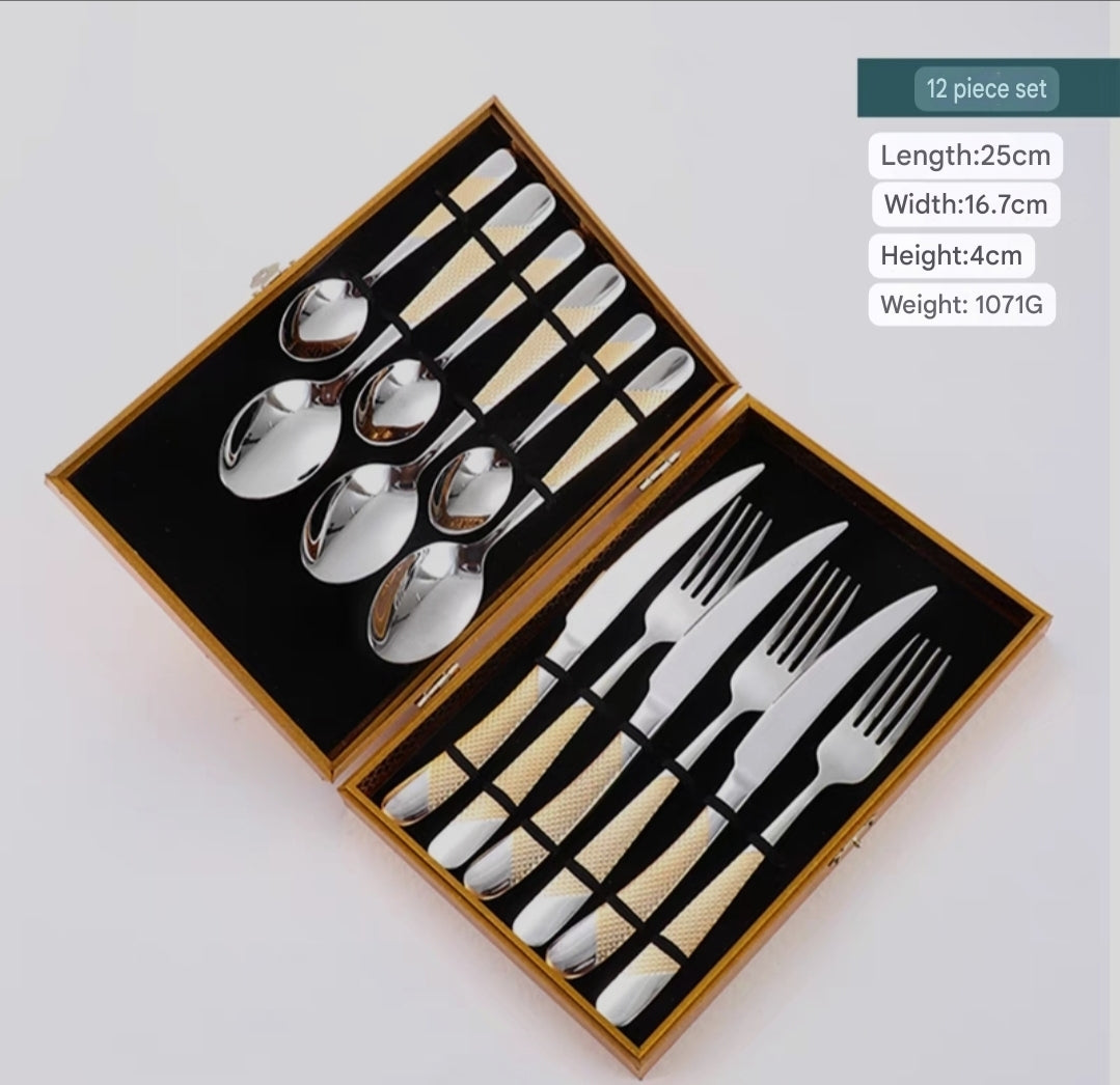 Elevate your dining table with this 24-piece luxury stainless steel cutlery set. Crafted from high-quality SUS304 stainless steel, each piece features a mirror-polished finish with elegant gold-accent handles, offering durability, style, and comfort.